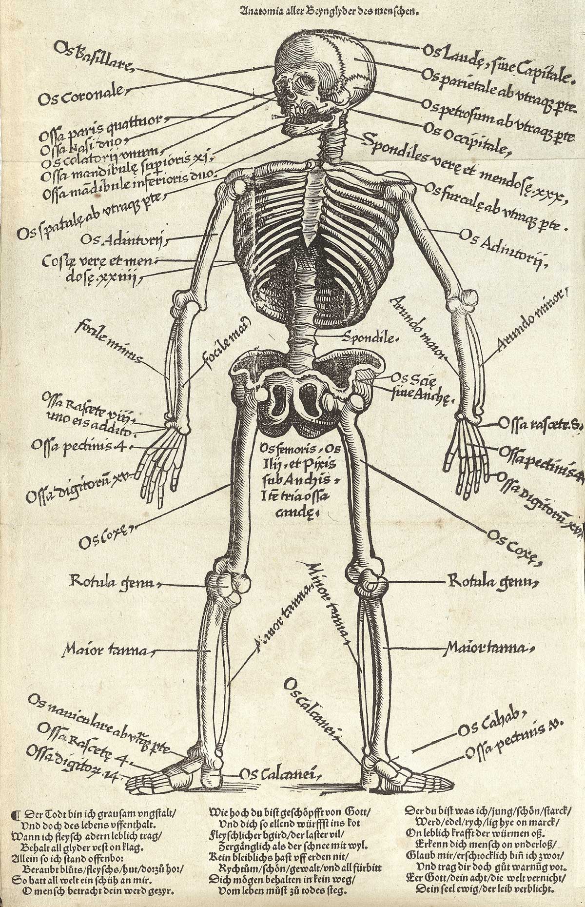 To start with, for example, in this very breezy survey is the indexing of the very first illustration of a human skeleton. from Anathomia ossium corporis humani, printed the year after Columbus arrived in the Americas--this was the first revelation to the real world of science following a sleepytime of about 8oo years under the very heavy gaze of institutional religions.