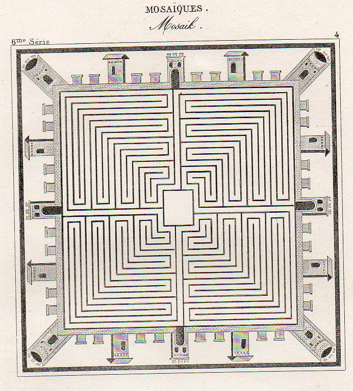 Then there's this beauty, showing an idealized town square, presented in mosaic as though seen from above, continuing this thread of flat-perspective--basically looking at some central part straight down, and then taking the objects surrounding the central figure and simply laying them on their backs, as so):
