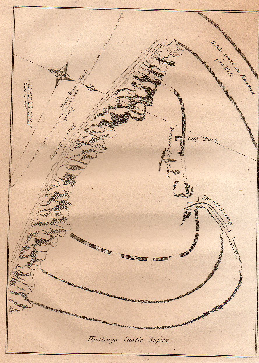 Lastly for now is this quite flat persepective of the remains of the Hastings Castle (East Sussex), which was built right after 1066 but before the battle. The (limestone) cliffs that did so much damage to the castle are clearly visible, though what was left of the castle is not. The view of the area of the castle shows the grounds both in perspective and plan and also from directly above. Its a more-naive approach to imaging that was done so well (on occasion) by the U.S. Coast Survey when it rendered a coastline with an inset of what the coastline looked like from the water--both were superior efforts, but a little odd if you took the map at face value. This map makes no pretense on perspective correctness, though it is overall a fine map, nicely displaying the necessary details accureately though not correctly (?)
