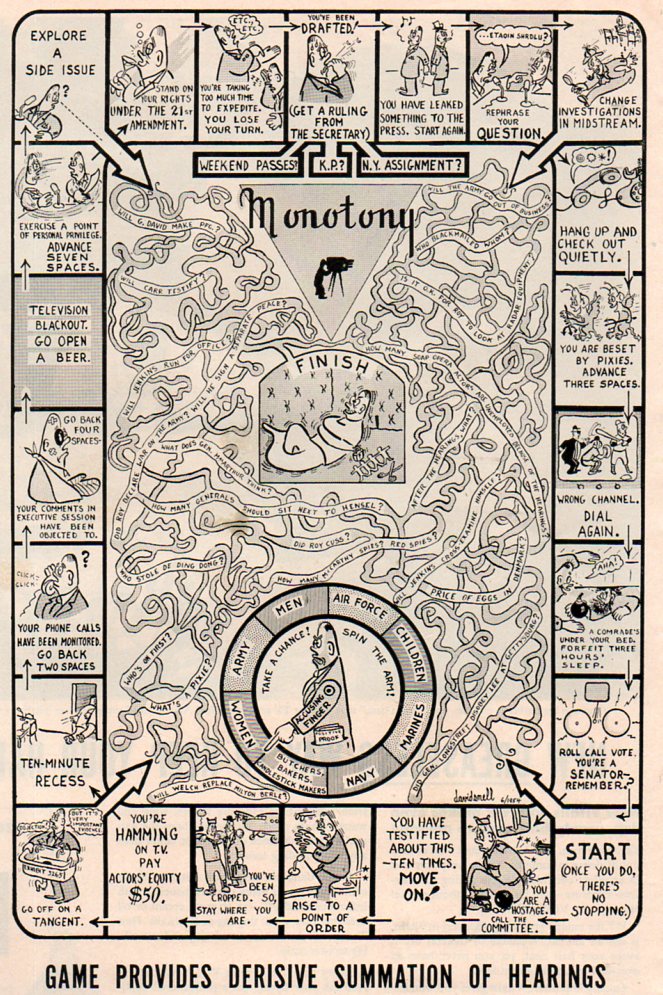 Which gets us now to this game, a mass of entwined spaghetti, which was a tongue-in-cheek poke at the Army-McCarthy Hearings of the spring of 1954, a popular review in the tradition of Thomas Nast that is very effective.. The "Army" was the U.S. Army, and the "McCarthy" was Senator Joesph McCarthy, of Appleton, Wisconsin, a man who was about at the end of a short, meteoric career of vast unsubstantiated accusation, discord, lies and fraud. The hearings were supposed to sniff out Communists in the Army and the defense industry, because that's what McCarthy did, being a rabid impersonator of a man with a decent mission. The hearings were long, involved, and traveled nowhere fast although much ground was covered.