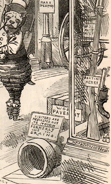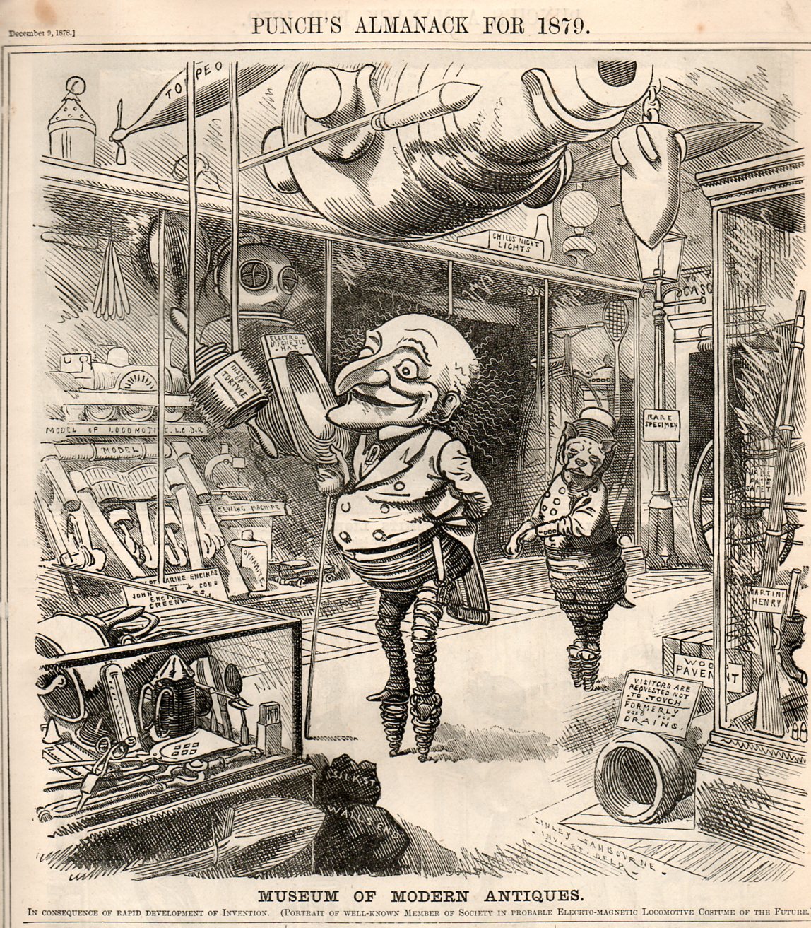 Yesterday I wrote a blog post on Thomas Edison's anti-gravity underwear, a satirical series of images that appeared in Punch magazine in 1879. The leading image of the Punch almanac for that year carried forward the electrical possibilities of the day, and featured Mr. Punch himself, strolling via some odd electromagnetic transportation device through a museum in the near future of the technologies of 1879 since put to a rusty bed, surpassed by the expanding newness.