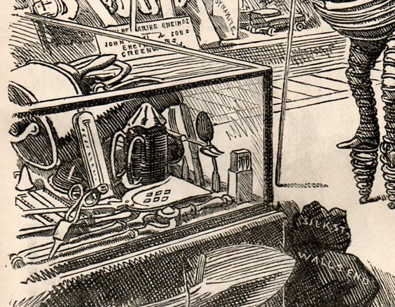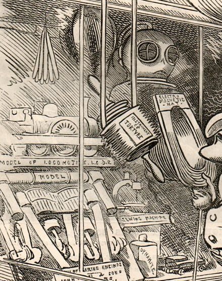 In the background we see a curious cabinet containing a deep-sea diving suit, candles, a boxing practice ball, a patent of a steam locomotive, another model of a propulsion system for a ship, a sewing machine (already in its third decade) and a box of dynamite (still relatively new at this time, having been patented in 1867). I am not sure what the ":instrument of torture" is.)