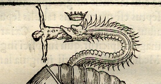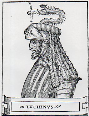 This seems a long way to get to this headdress of Luchinus (or Luchino I Visconti, who shared in the rule of Milan from 1339 to 1349, found in Paolo Giovino's Abbrege de l'Histoire des Vicomtes et Ducz de Milan, publihed in Paris in 1553), which was either real or not, but the image of the consumed man springing from the crowned head of the ruler was too much to pass up. I am assuming that the man is going into the snake/dragon, rather than the other way around.