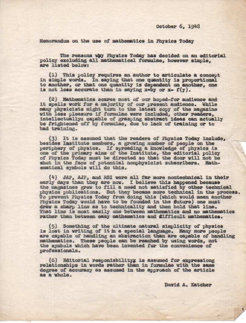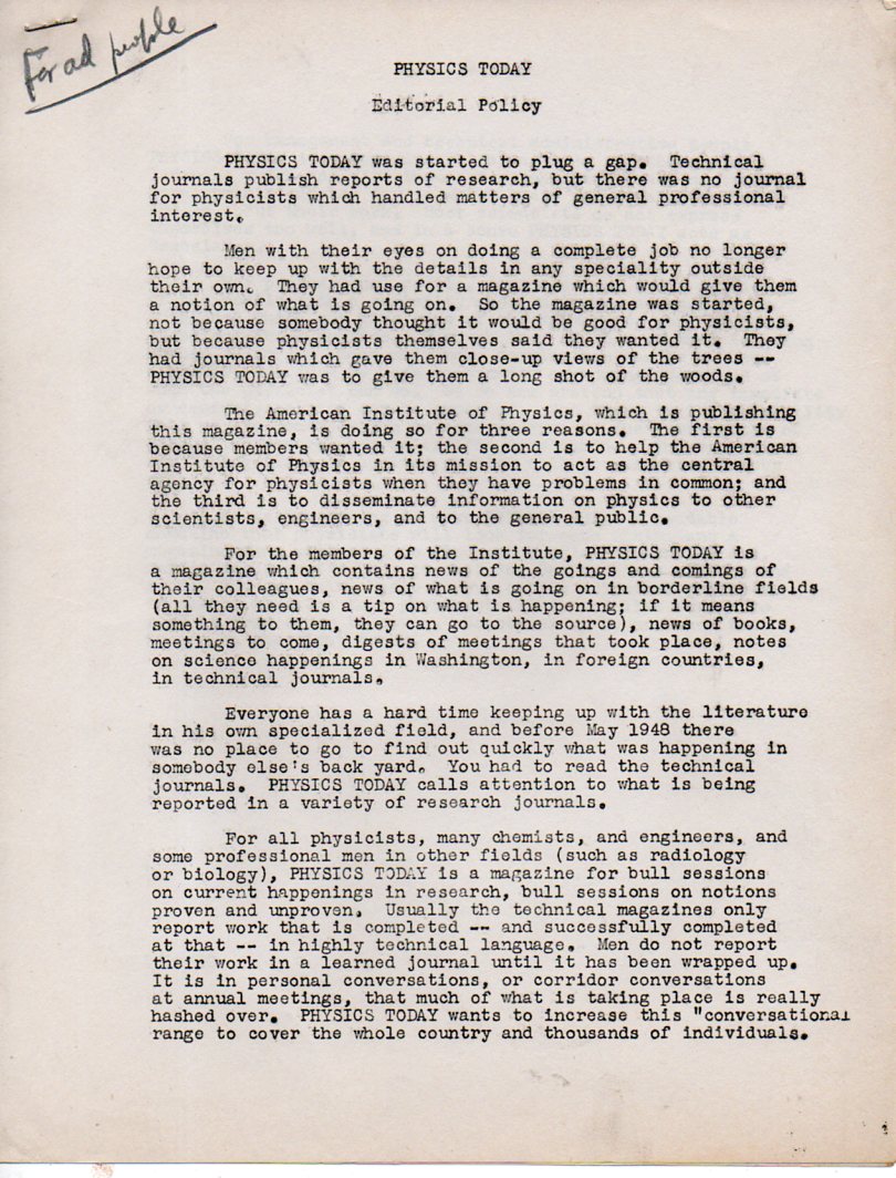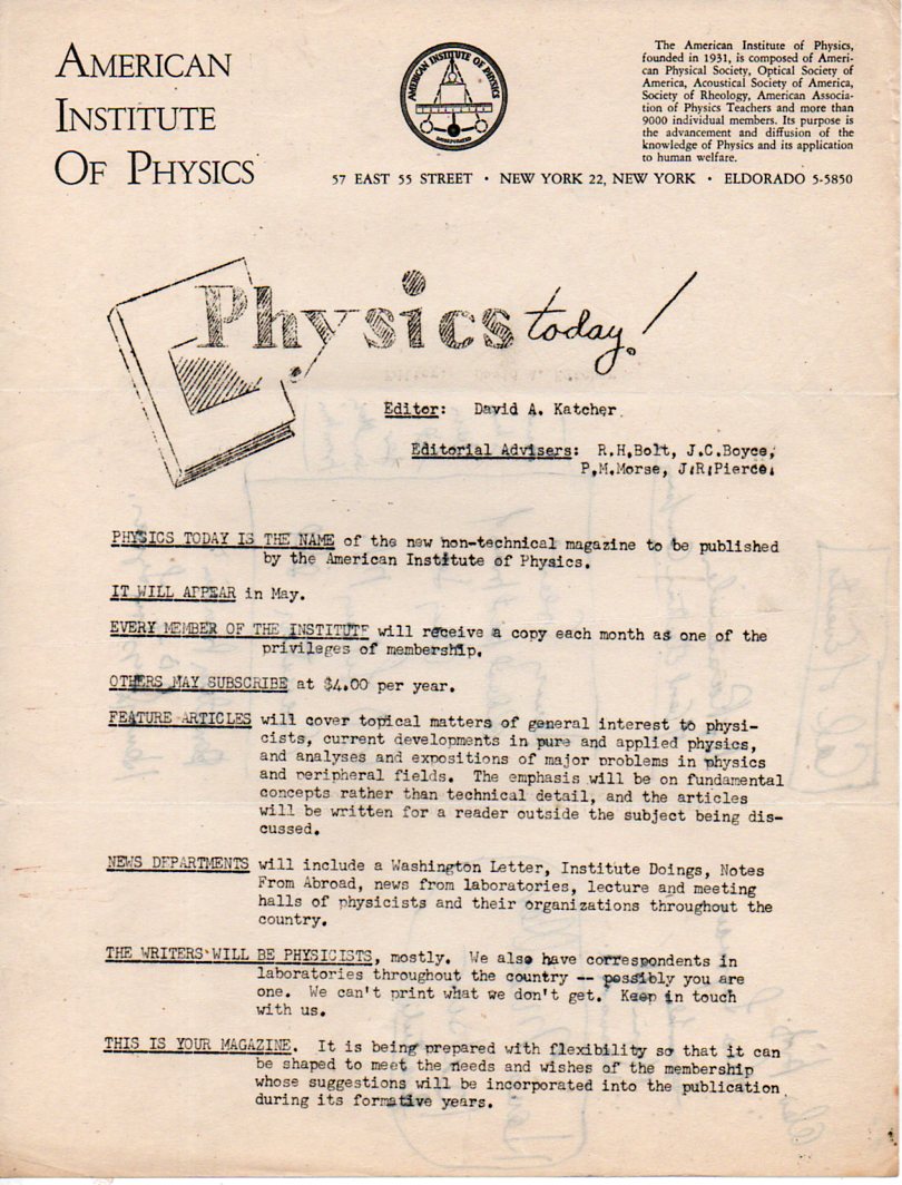 One of the real pleasures of being a bookseller is the discovery of the unexpected source--in this case it was a small group of papers that at one time belonged to David Katcher, who--among many other things--was the first editor of the American Institute of Physics' magazine, Physics Today. It was started in 1948 to help bridge the gap between good science writ bad and hard science writ even worse for the world of the general reader. These are a few of the fragments from the editor's desk, as Katcher was organizing his thoughts about what the magazine would be about, who would write for it, and how the ideas would be presented.