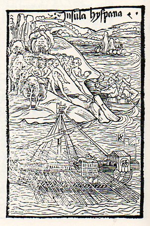 The first images of his adventures appeared in Oceanica Classis, printed by Johann Bergmann de Olpe, in Basle, in 1493--the first, below, showing an imaginary view of the Island of Hispanola. In the image of Insula Hyspania, below, we see Native peoples running from the approaching ship and long boat--they of course did not run far enough. (By the end of the 1620's, something like 75% of the indigenous population in contact with Europeans (or in contact with people in contact with them) were dead, mostly from epidemics and diseases and lesser illness for which they had no immune systems.)