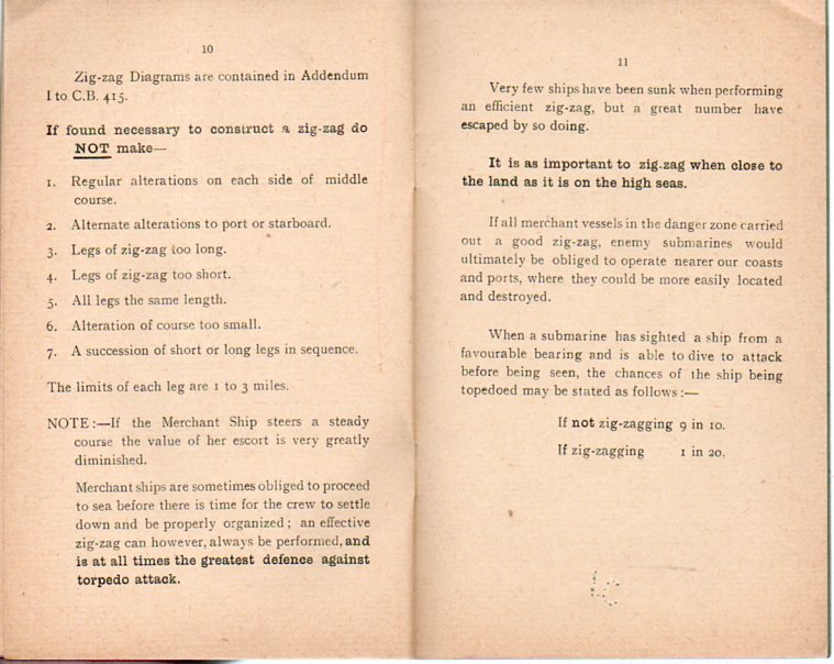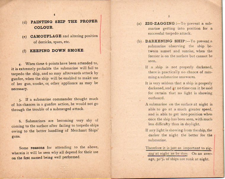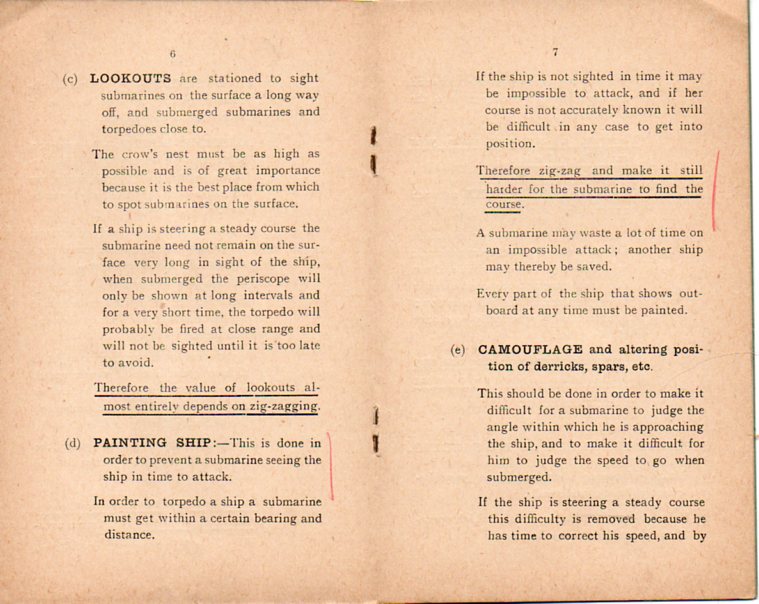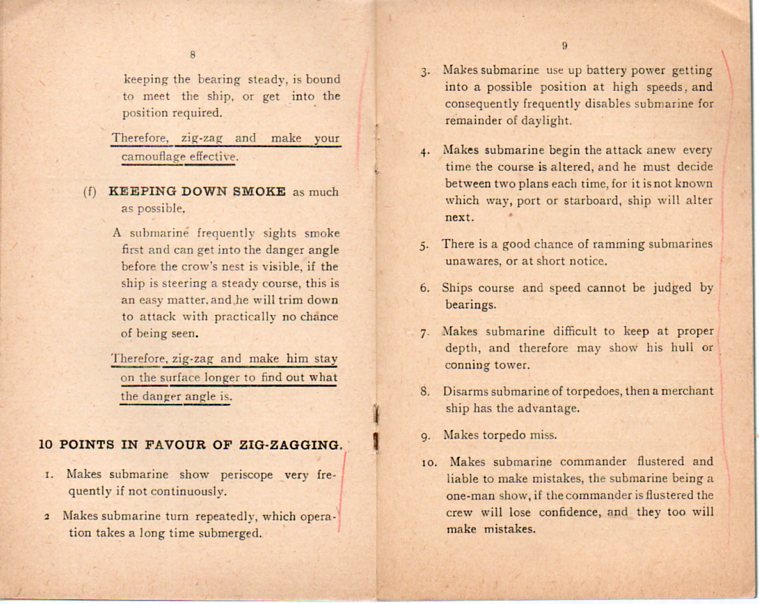 Merhcant Vessel v. Submarine, Some Reasons for Zig-Zagging (a "Confidential" report written by Lt. Commander A.G. Leslie and published by Wood & Co. in Chatham in 1918) presents logical, simple, workable solutions to the problem of the submarine, fallible solutions to what must have seemed to be infallible treachery. It is a pocket-sized, 5x3 inch talisman and survival guide for those ("For Masters of British Merchant Vessels") responsible for hundreds of lives and thousands of tons of ship, all of the good information boiled down to eight pages of loose type, a way to get around the subs, and weighing in at about an ounce.