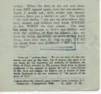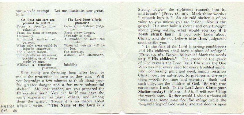 AS people took cover from bombs and fire in the subway system or in bomb shelters, proselytizers were on their way to work, too, as seen in this slip of a handout, Have You s Shelter?, published around February 1940. It seems that the maker and distributor of this tiny pamphlet didn't identify themselves save for an address from which more copies of the flyer could be obtained (61 Upton Lane, Forest Gate, London)