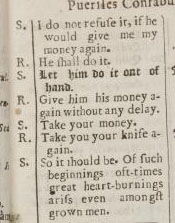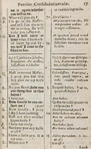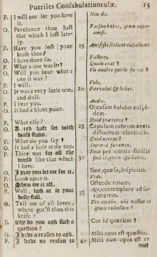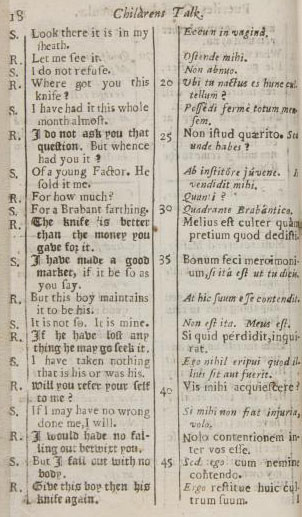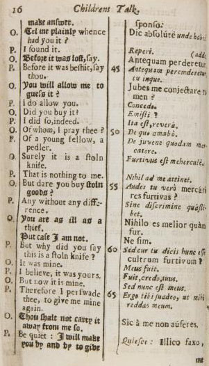 I foudn a curious book called Childrens talk, English & Latin... written by Charles Hoole, and the printed in 1673, in London, ostensibly to teach small ones the properties of Latin. It is filled with interesting stories which are small tests to logic and testaments to what was to be expected behavior, as told in this story of a stolen knife.