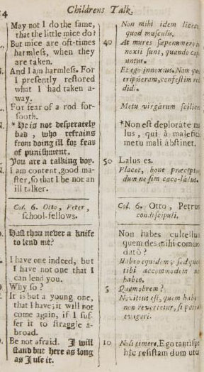 1. The full title is drawn out a bit: Childrens talk, English & Latin : divided into several clauses : wherein the propriety of both languages is kept : that children by the help of their mother-tongue, may more easily learn to discourse in good Latine amongst themselves : there are also numbers set down betwixt both, which do shew the place and natural use of any word or phrase / By Charles Hoole, Master of Arts, L.C. Oxon, teacher of a private grammar-school betwixt Goldsmiths-Alley in Redcross-street, and Maidenhead Court in Aldersgate-street, London