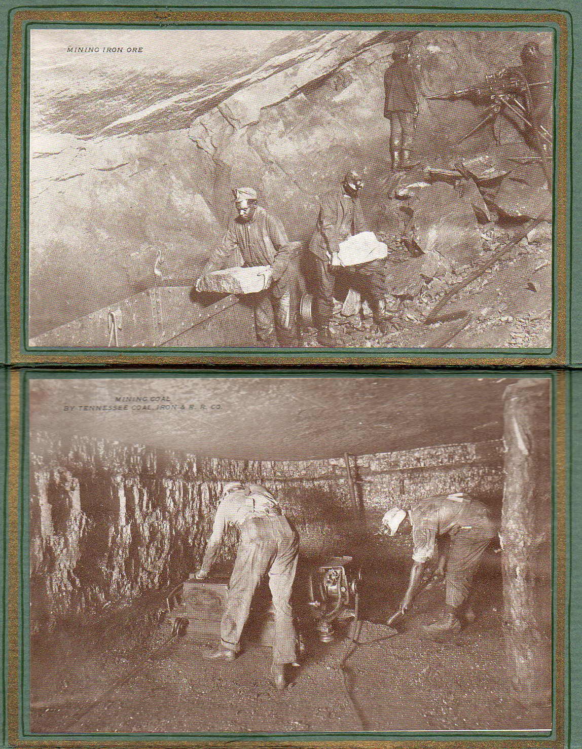 The other images relate mostly to the iron/steel industry, long a staple of the Birmingham economy. Five of the photos relate to the iron mining, blast furnaces, and loading steel rails; the other two are cityscapes of the city. In all of this, why two of the total of seven photos showed Black miners doing some body-breaking work in the mines is a mystery. The two men holding massive rocks in the picture detail is an exceptional thing--my guess is that the rocks weight 75-100 pounds, easy.. And if this is what these men were doing every day, they must've been exceptionally strong in a steel-bar sort of way, with enormously powerful hands. It just a mystery to me.