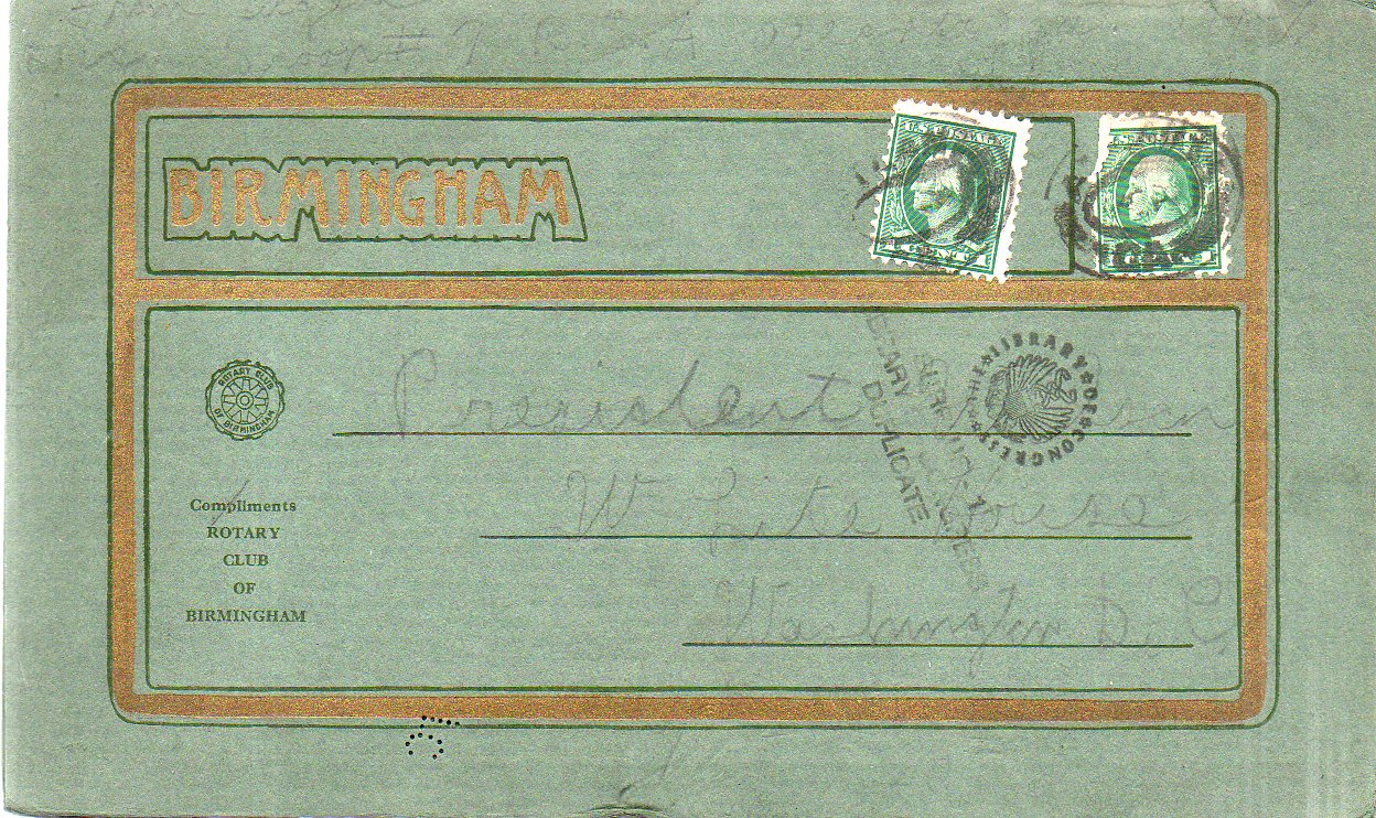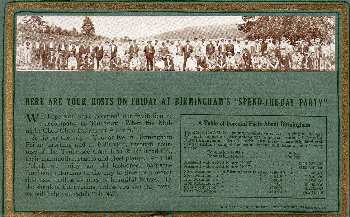 I found this item today out in thye warehouse, mixed in for some reason with Hitler Jugend pamphlets and many issues of the 19th century Archiv fuer Anthropologie, just completely out of place. It is an accordion fold multiple panel oversize postcard, I suppose, an advertisement for a meeting of the Rotary Club of Birmingham, Alabama, and probably for 1917/1918.