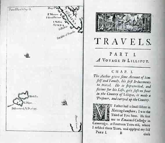 The blank spaces seem to occur more naturally on maps, in spite of the impulses of mapmakers (or at least their engravers) to fill the blank spaces with whatever might have been on hand--found or fictional or hypothesized landforms/animals/people/waves and such. But some came quite naturally to the blank and free spaces, even in fictional maps, like the following (from Jonathan Swift's Gulliver's Travels (1726, amended 1735), or Travels into Several Remote Nations of the World, in Four Parts. By Lemuel Gulliver, First a Surgeon, and then a Captain of several Ships):