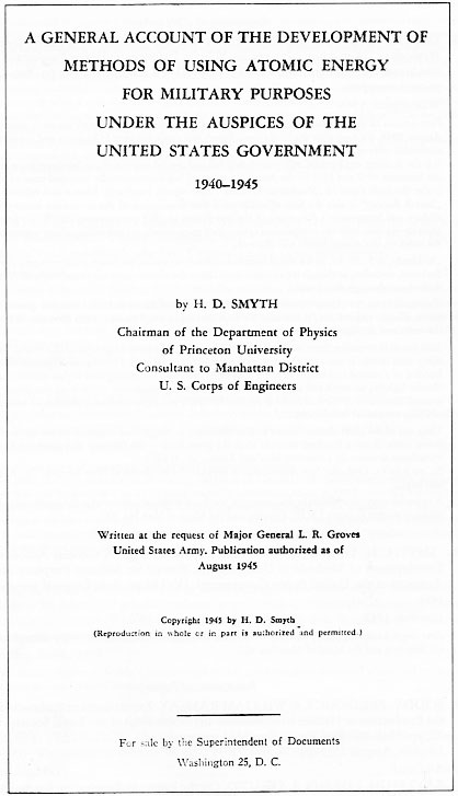H.D. Smyth's classic work establishing the guidelines of what could and couldn't be said about making the atomic bomb and the distribution of sensitive information also is somewhat deceiving spatially--it seems as though the page is filled, but it really isn't: