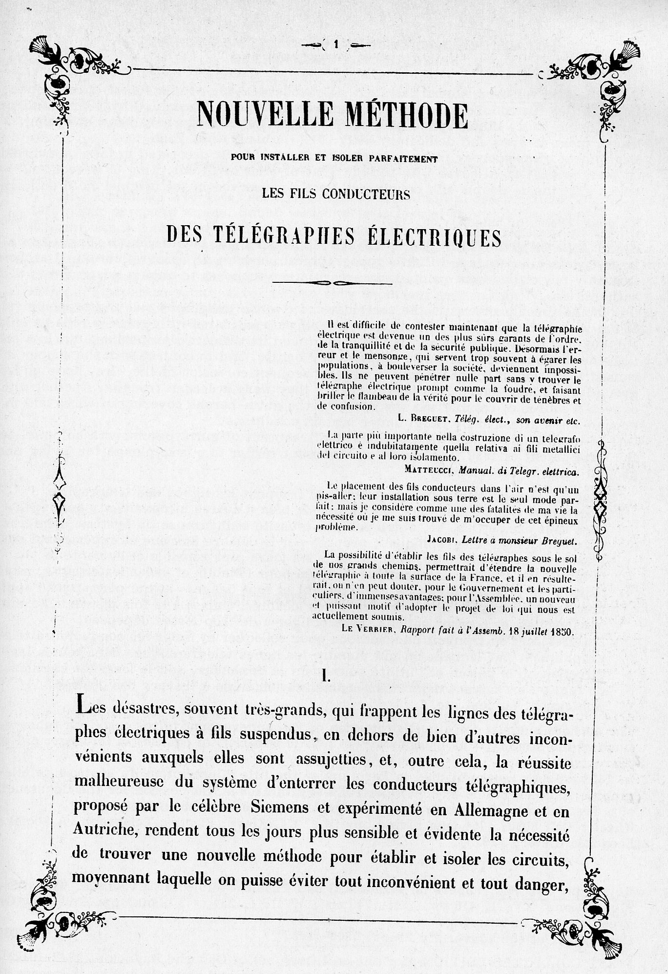 And an example that is both cluttered/filled and blank, there is Paul Rescalli & Pierre-Albert Balestrini, Nouvelle emthode pour installer et isoler parfaitement les fils conducteurs des telegraphes electriques (1850). This work doesn't nearly come into the same sphere of importance as the others mentioned here, but it was a significant thing, discussing a principal concern in tlegraphy, which was shielding the wires. Still, the title page is unusual in the world of blankness in title pages: