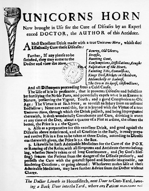 and especially one selling Unicorn horn curative extract? The cure promises of "the beast that no existence hath" (Rilke, Sonnets to Orpheus) sounded attractive, having the ability to dispense "scurvy, old Ulcers, Dropsie, Running Gout, Consumptions, Coughs, palpitations of the heart, Fainting Fits, Convulsions, King's Evil, rickets in children, melancholy or sadness, the green sickness, and all distempers proceeding from a Cold Cause" as well as "all crudities in the Body". But promises like this are almost always loyal only to that pretended self.