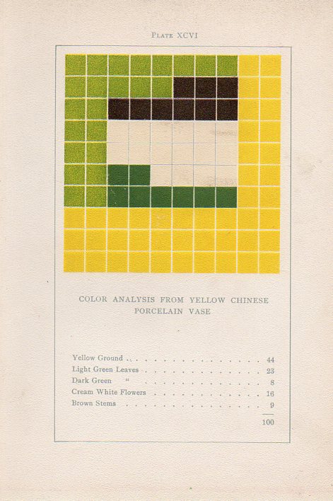 In trying to quantify the color images of the objects in her study, Vanderpoel establishes a 10x10 square grid, dividing all of the color in that object into individual units numbering to 100. Then, somehow, she identifies the major colors and places them according to a system that I cannot understand within the grid.