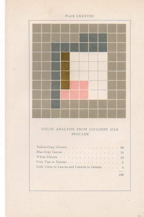 [Earlier in this blog, about 1200 posts ago, a million words ago, I wrote about an extraordinary book by an aesthetician named Emily Vanderpoel. It is "extraordinary" in a narrower sense, and that "extraordinary" might not actually be positive for its original intent. The extra-intent of the book, what has come out of it for me, was something that was unintentionally accomplished by the author. The images that she used to illustrate her color theory ideas--the basis of which are not really comprehensible to me--turn out to be artwork in themselves, a found art, the artistry of the images taking over the original intention for the arrangement of their color. I've found the book now at the Internet Archive in all of its glory, and downloaded only 150 times. I'm still at a loss to know why this work hasn't received more attention
