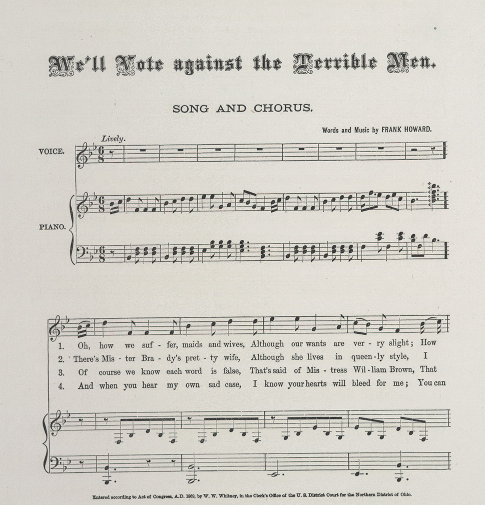 This piece of Suffragette music was published in the incredibly-named "Palace of Music"by W.W. Whitney in Toledo, Ohio in about 1869. For most intents and purposes the women's vote movement was still in its first generation, and still five decades away from a national vote for women. The music and words were those of Frank Howard (not of the Baltimore Orioles, as this Mr. Howard was born in 1823). Images courtesy of the vast colelctions at/connected to the Library of Congress, here.