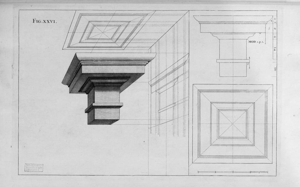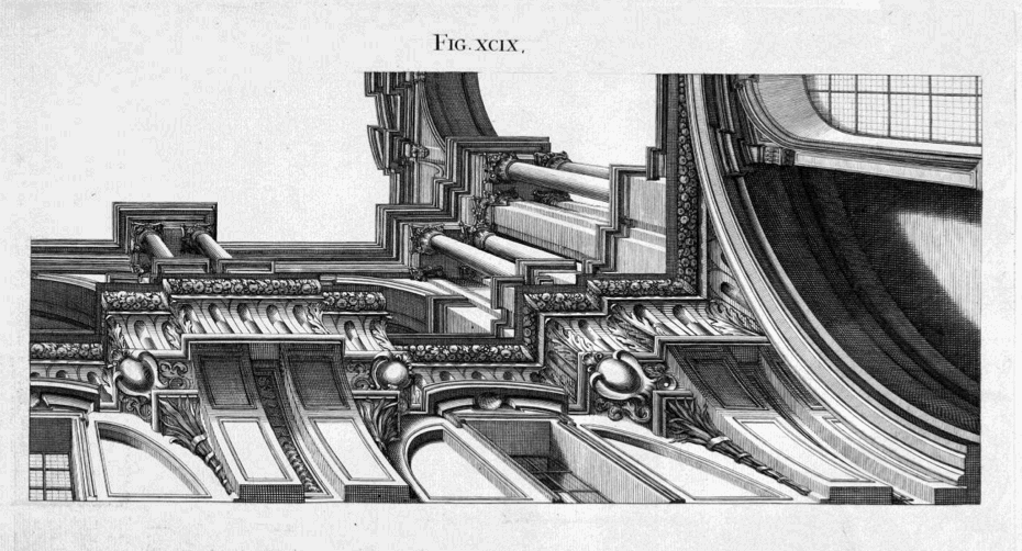 The fantastic Jesuit Andrea Pozzo published results of his researches on perspective in his Perspectiva pictorum et architectoru (1693), explaining how he was able to compellingly, unbelievably represent three-dimensional images on two-dimensional spaces, this image showing plan and projection and profile, effectively giving you a three-dimensional cross section of the architectural element...and having them seemingly float in space. His work is just absolutely gorgeous.