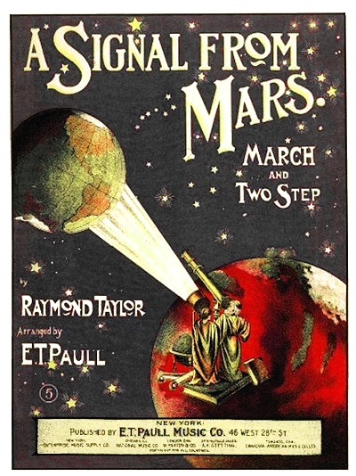 In this episode of the Strange Things in the Sky Department there are a number of posts dealing with Strange Earths--sometimes there are strange Earths int he sky, above the Earth. And so on. In this small offering we see a green-sea earth viewed by Martians from, well, Mars. It is the cover art for sheet music "A Signal from Mars", composed by Raymond Taylor and arranged by E.T. Paull in 1901. Somehow the Earth is being illuminated by a small canned power source of high energy light that must have the energy of a pulsar, and there's a five-pointed star that is added for unknown effects. There's mot much more that can be said, except that the music (sampled below), which is a ragtime march, has nothing to do with Mars so far as I can tell. Mars was certainly in the news when this sheet music was published in 1901--Percy Lowell had taken it upon himself to interpret Giovanni Schiaparelli's 1877 of "canali" on Mars as "canals" rather than "channels" and convinced himself that what he was seeing with his superior instrumentation were indeed structures built by engineers of another race on another planet. So, perhaps "A Signal from Mars" was much like the Atomic Motels in 1945 and Radium Cakes in 1897--folks just used a popular name in the news to excite interest in their own work via association with repetitive references.