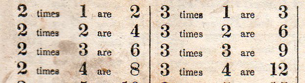 But what we find here, in one of the many tables in the book, is the surprising "3 times 3 are 9" rather than what we normally hear in the U.S. as "3 times 3 is 9". Perhaps what we are saying is "three threes are nine" or "seven threes are twenty-one", and so perhaps this really should be "are" rather than "is", except in the case of a number multiplied by one, when we would use "is" (as in "1x3 is 3", or "one three is three"). This would not be so for "3x1" where we are saying "three ones are three").