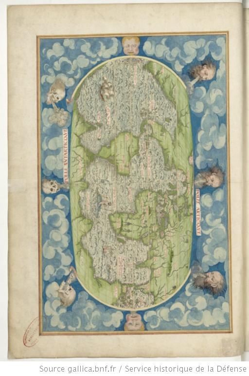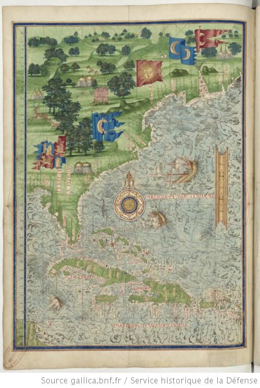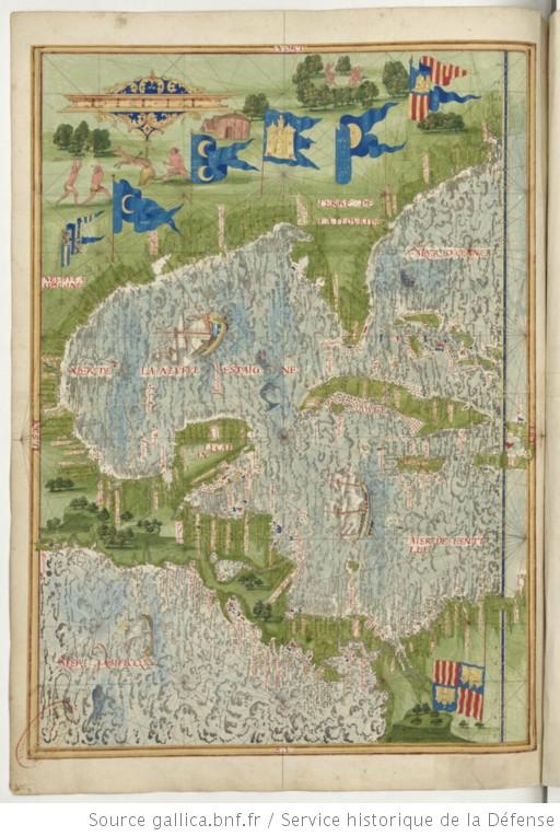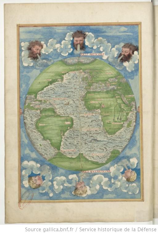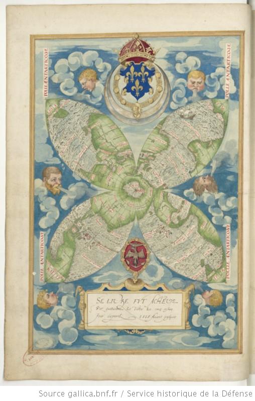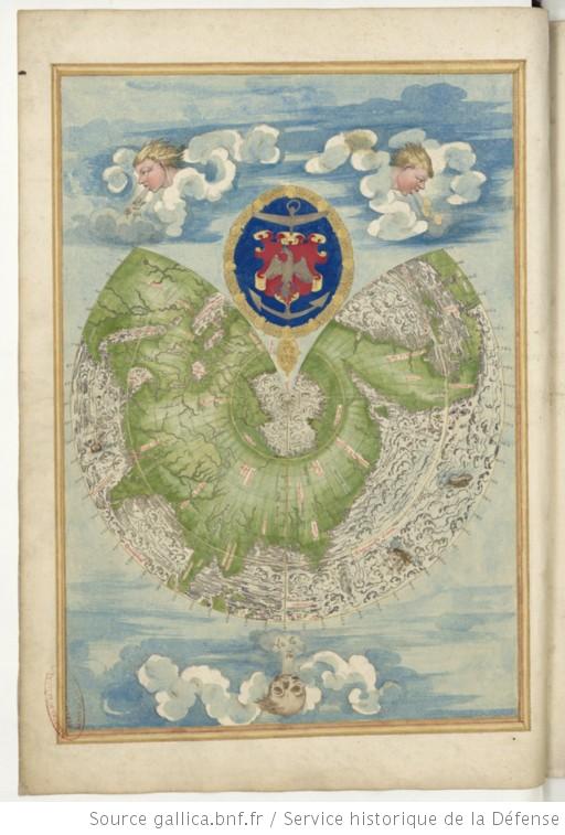 These fabulous maps appear in the cartographer/privateer/navigator/explorer Guillaume Testu (1509-1572) Cosmographie universelle, selon les navigateurs tant anciens que modernes / par Guillaume Testu, pillotte en la mer du Ponent, de la ville francoyse de Grâce, which was a manuscript atlas composed in 1555 or so, and found online courtesy of the Bibliotheque Nationale (Gallica). It is extraordinarily rich in design, color, and most significantly in detail, much of which was real.