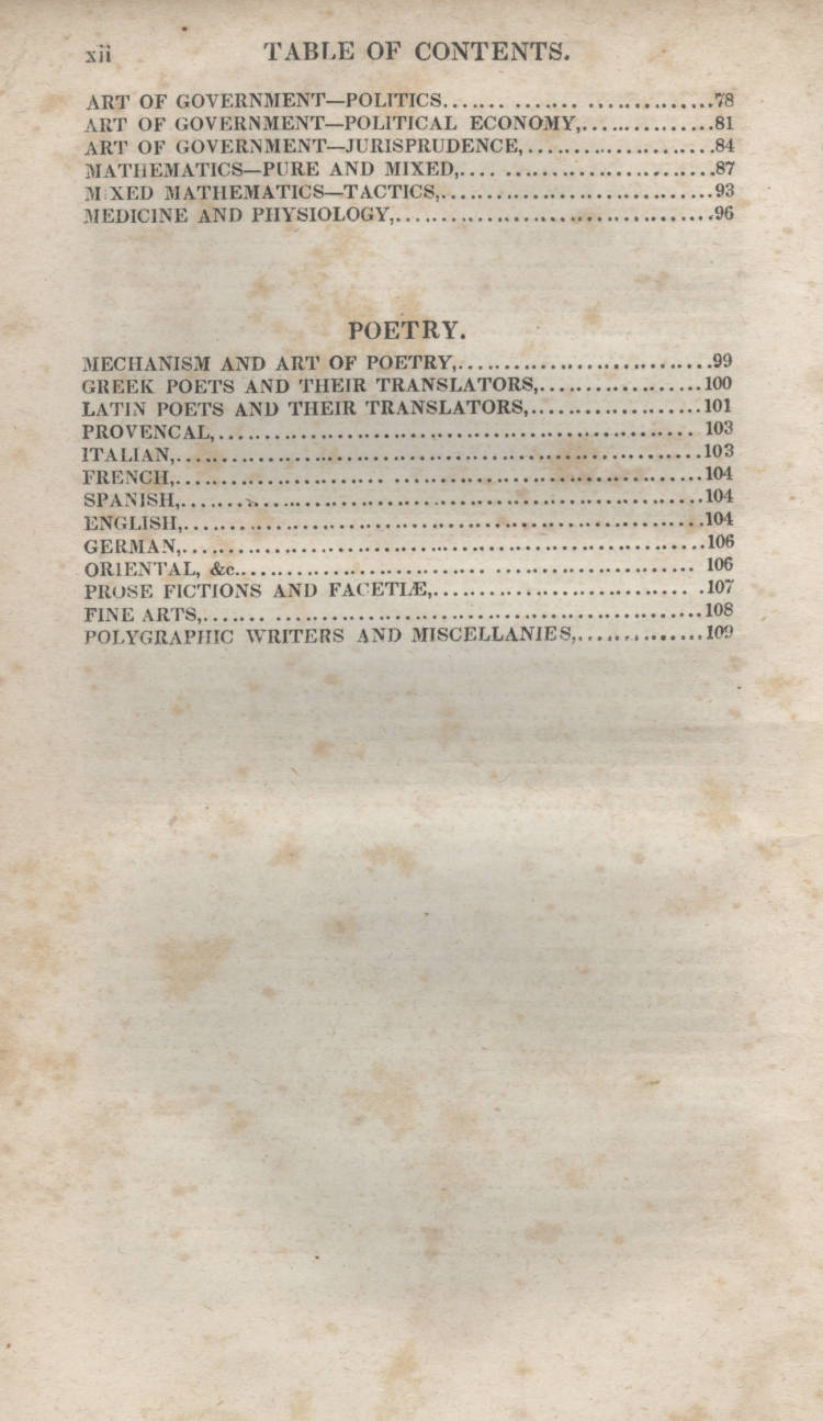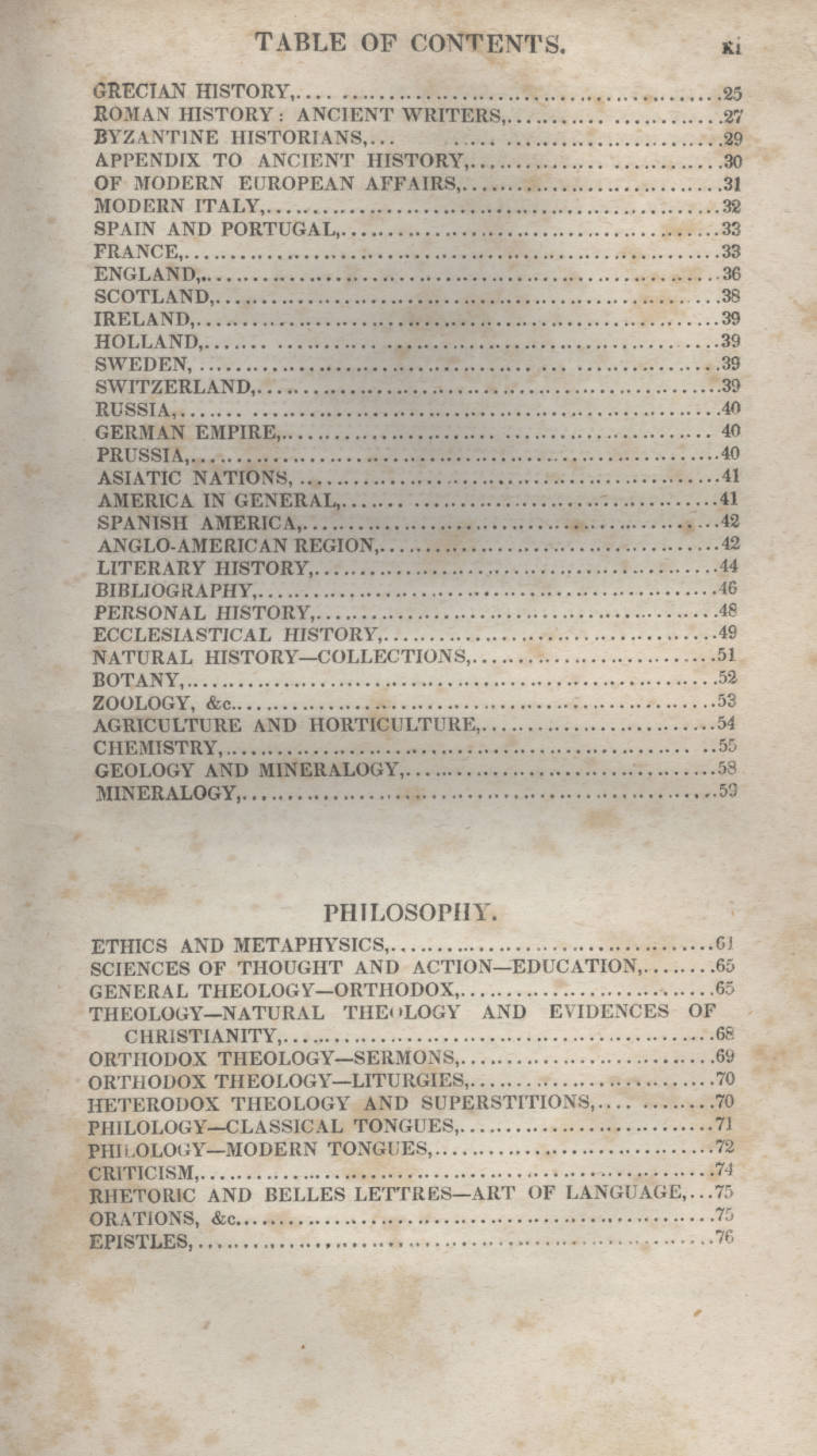 The full image, via the new Digital Library of America, here.There are 108 pages of entries for books, making roughly 5,000 titles. Books classified as "history" take pages 1-59, "philosophy" 61-96, and "poetry" 99-109. Given that this is supposed to be a history of science blog connected to my phys/maths bookshop, I looked for "math" and found it among other contenders in the second division, "philosophy". It is categorized such along with the book entries for ethics, metaphysics, general theology, philology, criticism, rhetoric, orations, epistles, government, politics and medicine. Math here is "Math, Pure and Mixed" and "Math Mixed, Tactics", and occupies the largest section of the philosophy section--unless of course you add together al o fthe variations of "theology", and then the maths come in second.