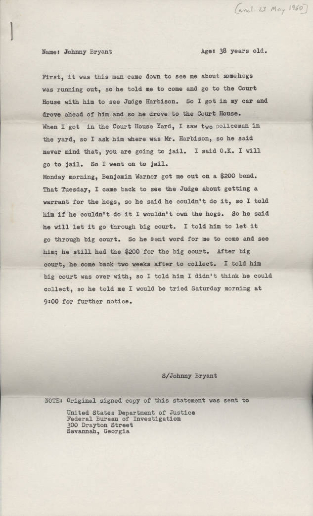 The very first thing I saw on the new Digital Public Library of America website (here) was a randomly-selected timeline--I selected 1960 and then clicked on the first thing I saw. It was a deposition of a Mr. Johnny Bryant of Savannah, Georgia, on a case involving hogs in some way, and made on 23 May 1960. It is a single-page typed document made to the F.B.I., and it has a certain Surreal style to it wrapped around a problematic content. The following is the document after running it through our Poem-O-tizer--it is the entire text with different spacing. It makes its own case as, well, something.