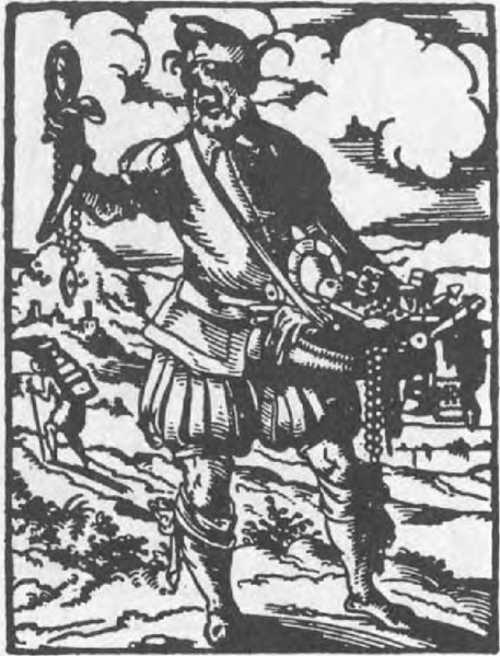 K. Kraemer (actually a street peddler of endless objects, though I felt compelled to use "Kramer" for this via Seinfeld influences. Interesting to note that this same illustration is used to image the "natural fool", one of the few of the woodcuts that were multi-purposed.)