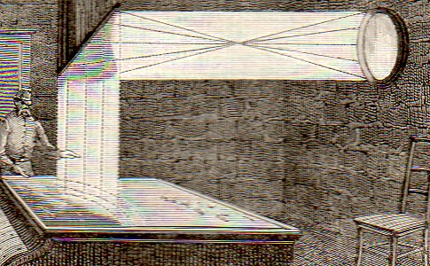 I'm fairly well certain that I have never seen an image of a camera obscura being used for military purposes--until today. I found "The Camera Obscura in Torpedo Work", in the great scientific journal Nature, for 26 February 1885, pp 389-340. Here's a detail:
