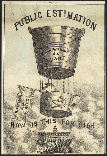 The floating lard aside, the image is disturbing and heart breaking. The pig has every indication of kindness and quiet enjoyment, flying a small flag in his gondola of floating fat, being taken away to points probably-known. The image was found via Bibliodyssey, and the image used is from the collection at the Boston Public Library Print Department. (Interesting to note that the entry at Boston lists the following: "Subject: Swine; Corn; Oil & fats; Animals in human situations").