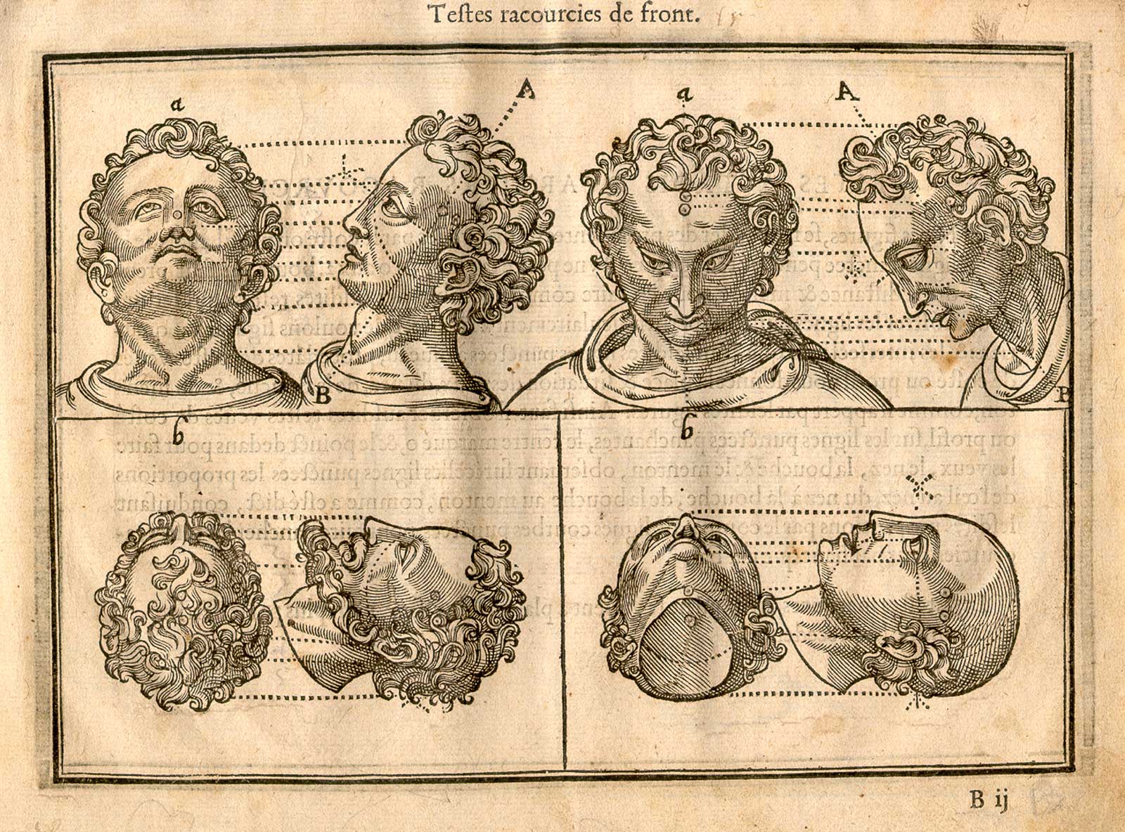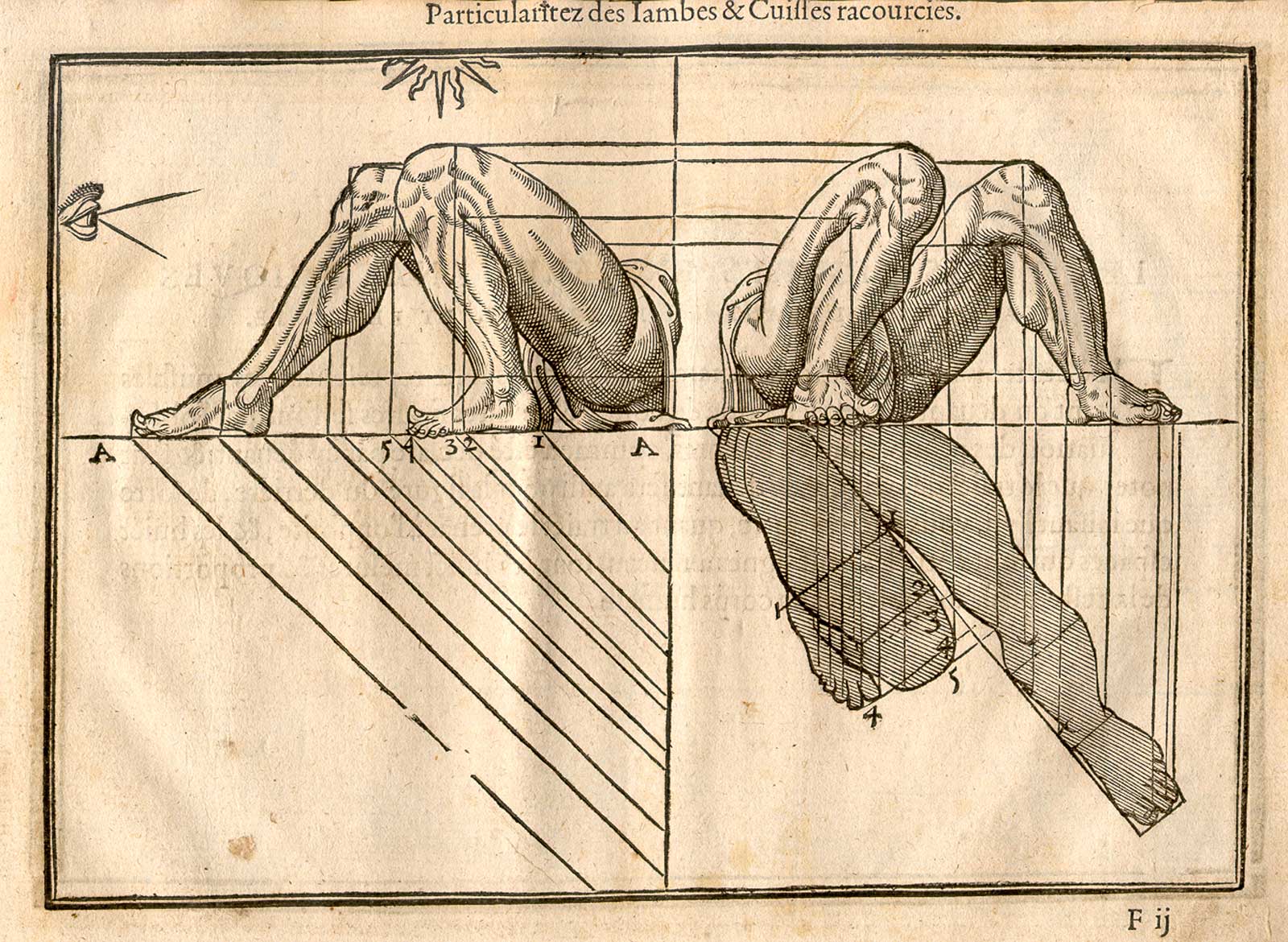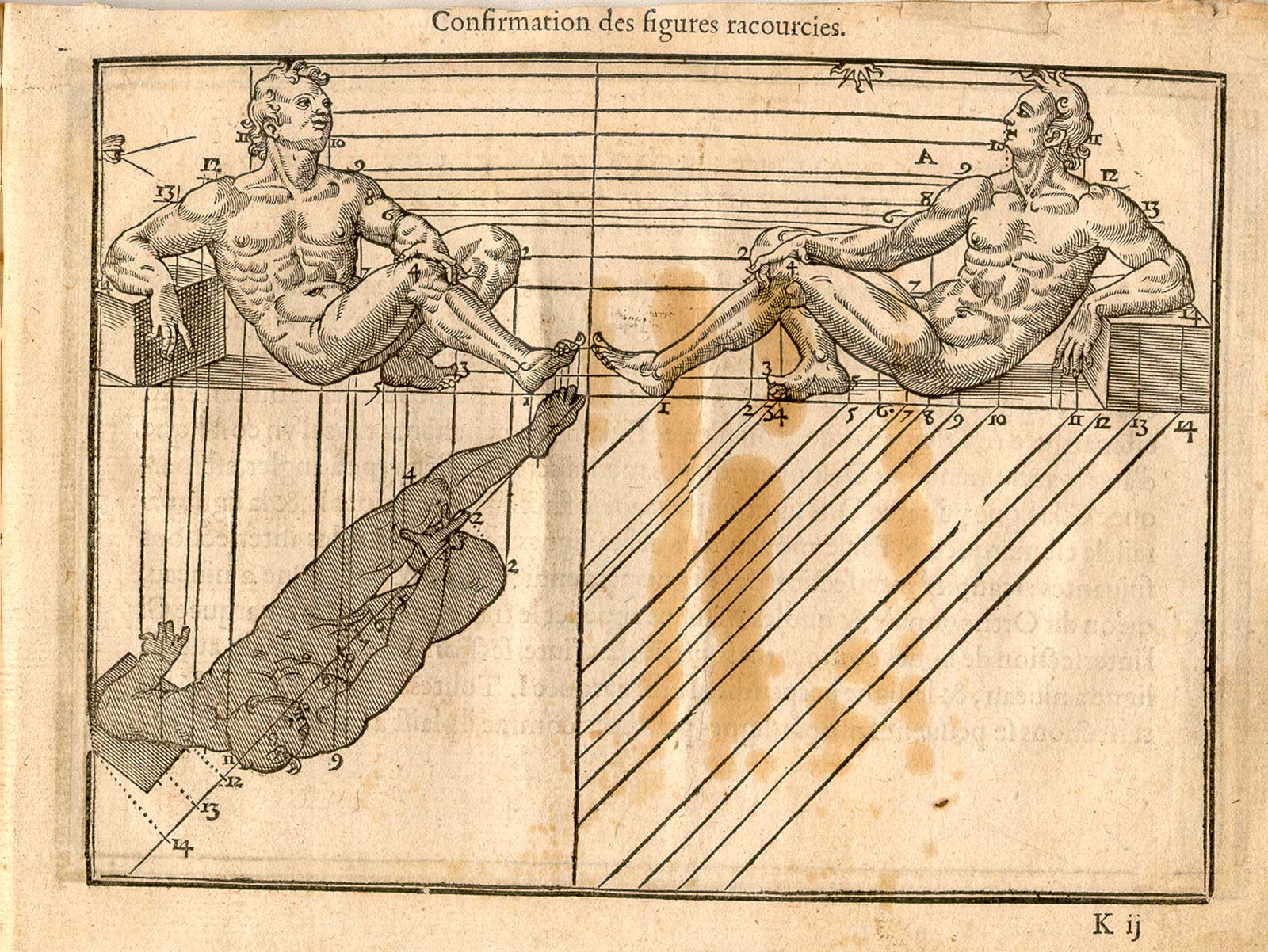 I'm not sure if I've ever seen a 16th century human perspective drawing showing the body in plan and elevation and cross-section. Jehan cousin the younger (1522-1595, in France), the son of Jean Cousin the Elder (1490-1560), a painter and sculptor, produced such an image in his Livre de Perspective, which was published in 1560. Well, the image definitely was published in 1560, though the artist may have been father and it may have been son--they worked closely together, and the Younger was taught at great length by the Elder, so much so that their work became indistinguishable. Nevertheless, the images I think are quite extraordinary, as we see below: