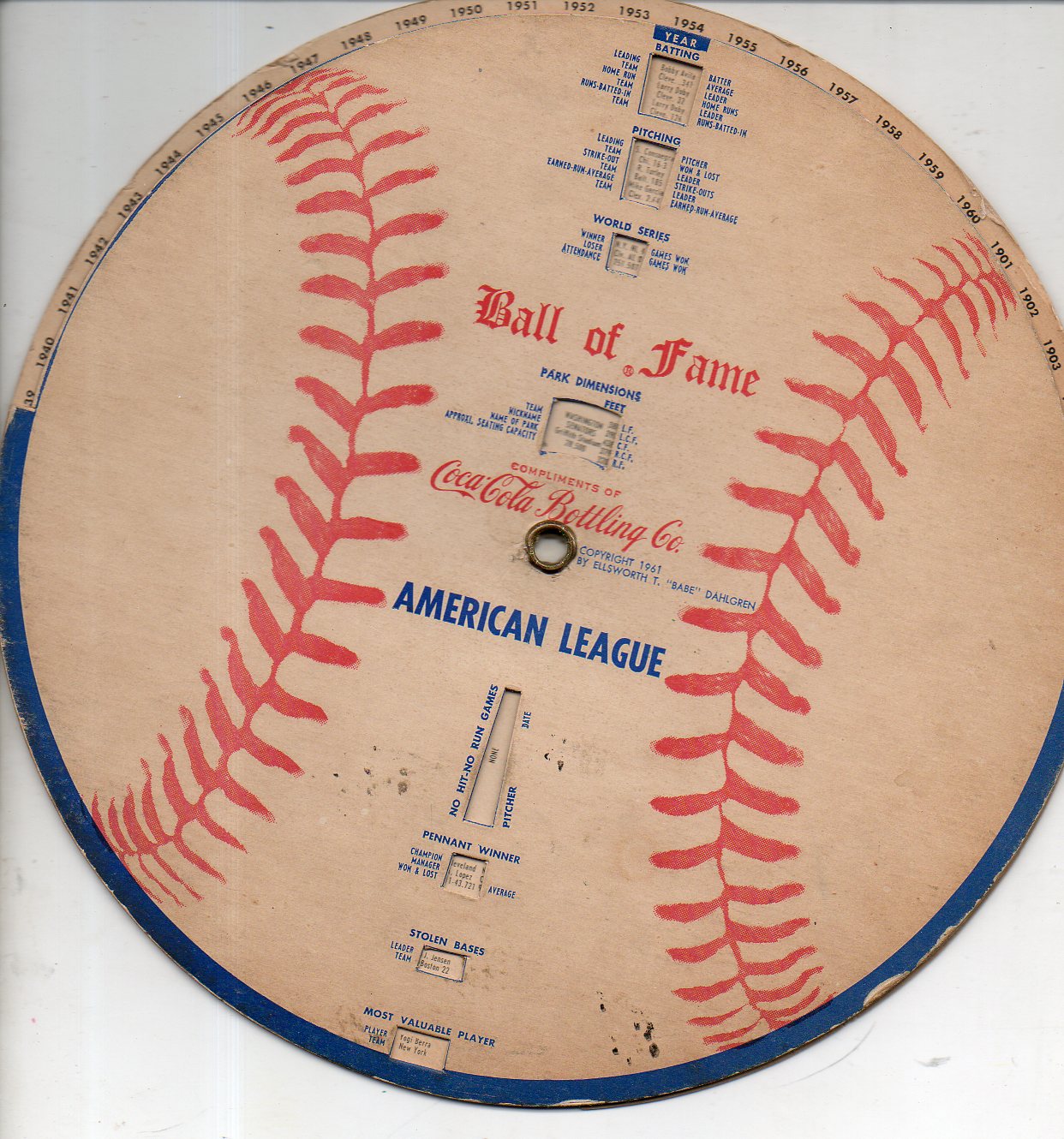 I've accumulated 50 or so paper computer/calculators of various shapes and sizes and descriptions, ranging from calculating the mileage for a 1959 Rambler, the ground speed for a B-25, radiation dosimetry, one-handed bridge, nuclear weapon yields, political history quizzes, and many others--including this "Ball of Fame" baseball historical paper volvelle.