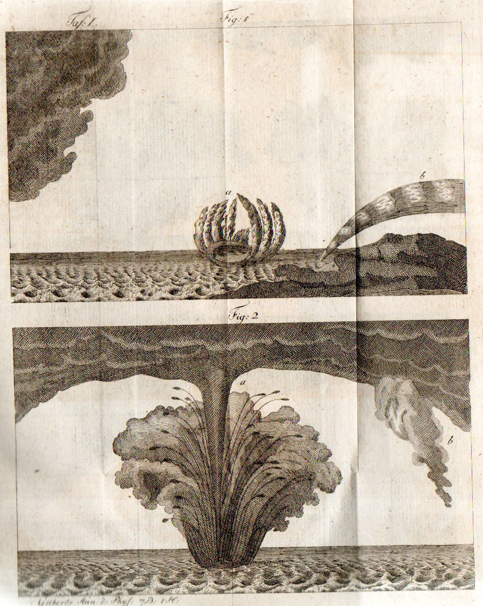 The first installation comes from series 1 volume 7, 1801, from an article about the work of Michaud on waterspouts, "Beobachtungen einiger Wasserhosen...". (The subject of waterspouts is an old one in scientific literature, most notably appearing in the scientific journal world in the Philosophical Transactions and reaching back to at least 1695, and Michaud's work on the subject extends to at least 1788. The use of waterspouts and tornadoes in art and in scientific literature in general is much older, with printed depictions of these creatures stretching back to the early 16th century. See this lovely and very useful site for a chronological display of tornadoes and waterspouts.)
