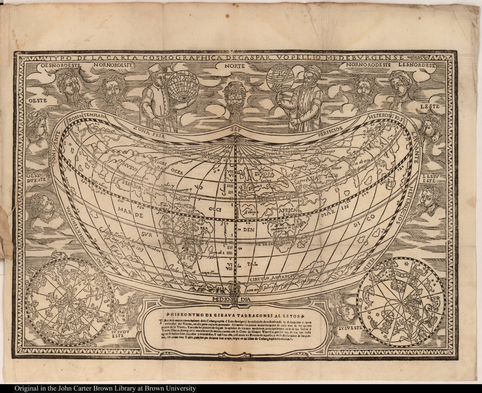 The example below is from the upper left corner bit of a cordiform wall map of he world, a massive and old 4'x6' effort, which was designed by Caspar Vopell (a map and globe maker, and a professor of mathematics at the University of Cologne) and printed in 1558, and was mostly the result of the map-maker's projection.