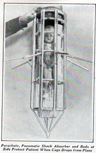 This was a model of sorts for a critical-care-parachute-gurneystretcher, or something, for when a crew member of a U.S. Army Air Force aircraft was injured and needed care, though the article doesn't specify where the person would be dropped. Overall it seems not the height of workable ideas, and suffered no doubt from its model using a baby doll, which just looks altogether wrong.