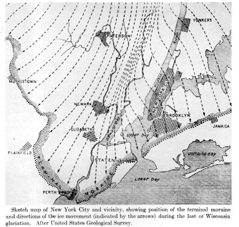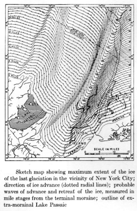 This was the southernmost lobe of the Laurentide ice sheet, a vast plain of enormous ice that covered most of North America, the last bit of which dissipated around 22,000 years ago. The maps reconstruct a bit of that glacial topography--the physical kind, not the one you'd experience walking around TriBeCa ina brown suit. Where the lines are closest together is the channel where the Hudson River would flow.