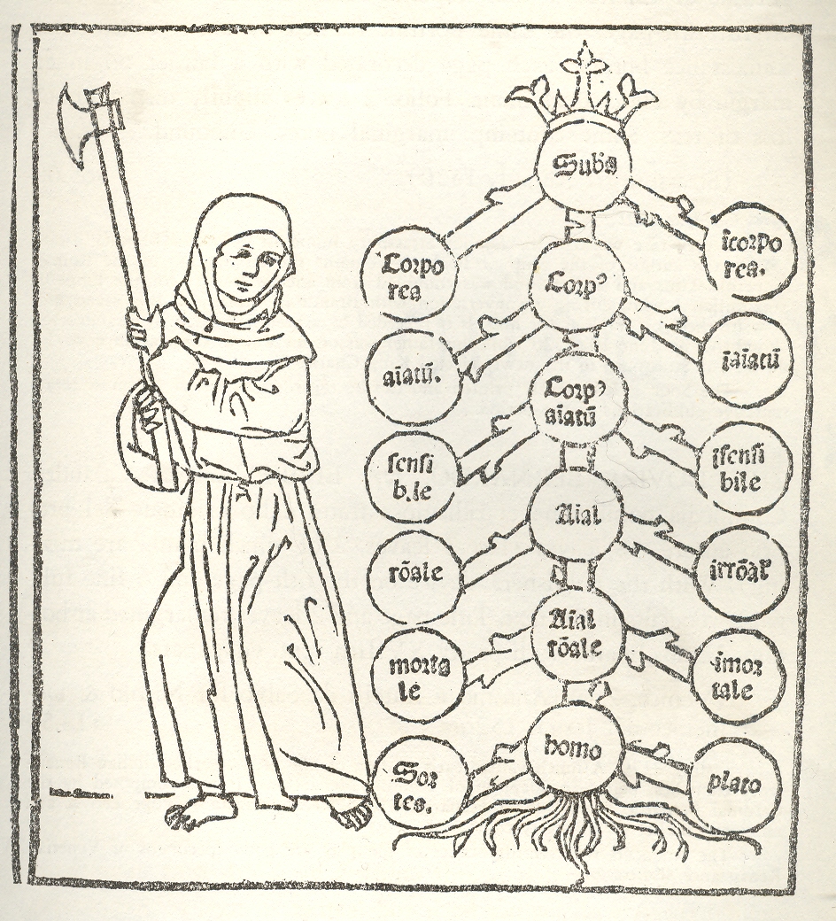 Well now: I don’t know what the provocation or inducement is here to hurtle this axe-swinging monk to attack Porphyry’s Tree1, though it would be interesting in a forensic sort of way to know what the tree’s section might reveal. The “tree” was a diagrammatic creation of a 3rd century Syrian mathematician/logician/philosopher named Porphyry who-- much taken with Aristotle (and with the Categories in particular)-- developed a systematic approach to the organization of thought in diagrammatic form.