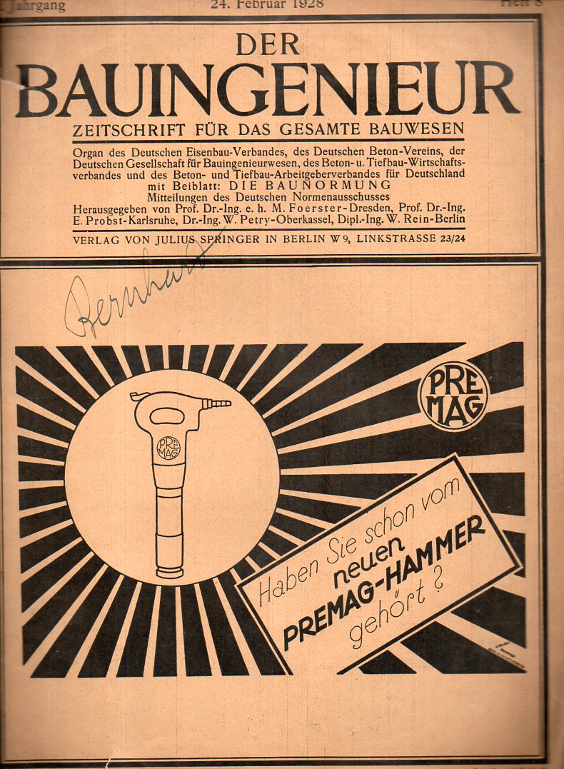 There are sometimes exquisite images found in the mundane and every-day, beautiful objects hiding in plain site. Perhaps that is all there is, really, everything around us being available for beauty just for the looking-at-it, finding it. (See an earlier post, The Beauty of Ball Bearings, for example. There is another series of posts on Looking Hard and Closely at Prints, which is more like taking a paper microscope to complex prints and finding the glorious minuatiae lurking in their minimal worlds.) In this quick example here I was stopped by what looks like a fantastic illustration of a jackhammer found in the Der Bauingenieur, Zeitschrift fuer das Gesamte Bauwesen for 24 February 1928--right there on the front cover. It is one fine piece of design, and may be the finest imaging of a jackhammer I've seen.