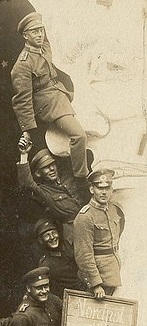 Nearly all of the WWI photos that have appeared on this blog are from my own collection--this one, this fabulous one below, is not. It is a fantastic image that I think would bring up notions of crazy proofer types looking to establish the idea that Nazis actually went to the Moon and have been hiding there since 1945--but no. it is just a great photo. Also: I've seen a number of photographic postcards like this from folks at a country fair or some such thing, having their picture made sitting with the Man in the Moon--soldiers included. But I've never seen one with this many people involved.