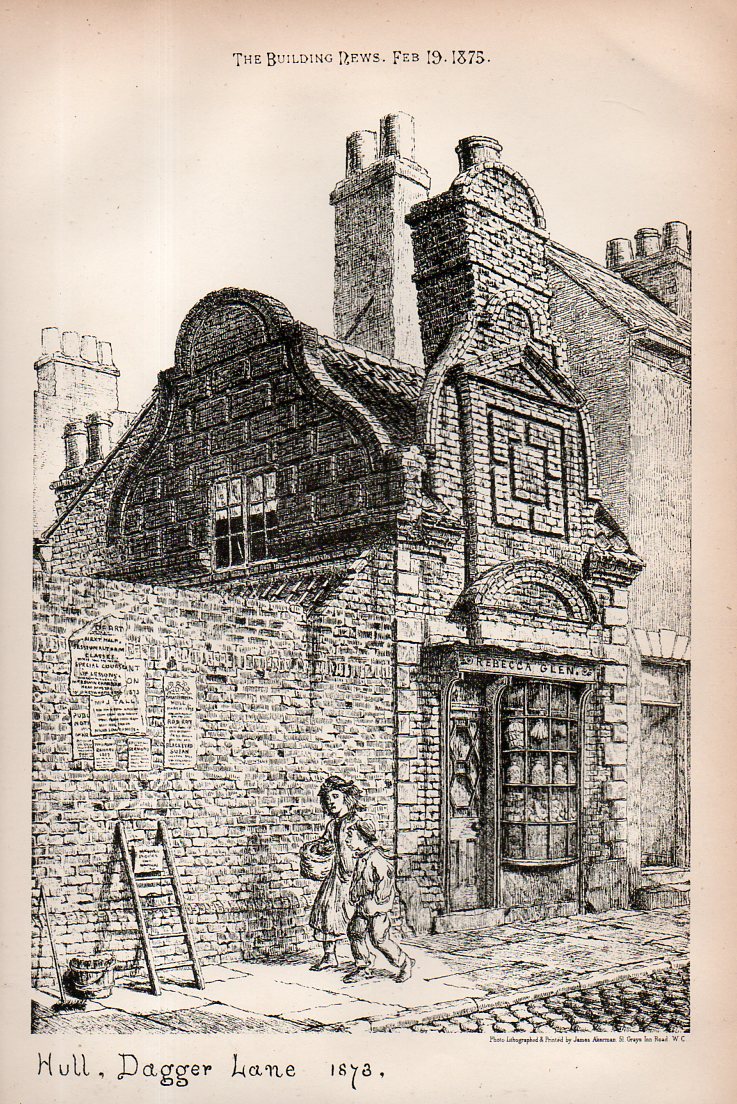 Breezing through a volume of Building News for February 19, 1875, I came upon this interesting lithograph for a building in Hull, a city in East Riding of Yorkshire, England. It depicts ancient brickwork on "an old house in Dagger Lane", in one of the "nooks and corners of ancient Hull, an old city reaching back evidently to the 13th century. (An interesting assessment of this building appears here at Paul-Gison.com.) What attracted me in this image was not necessarily the ancient structure but the empty ladder--and I can say that after having looking at x-thousands of antique prints that (a) ladders are uncommon and (b) unused ladders are even more so. Here we see t he ladder of a person posting bills on a wall, his bucket of paste and brush on the ground, the next poster on a ladder rung, and the laborer just not present. It is an interesting snapshot of a bit of daily life not usually recorded from long ago...