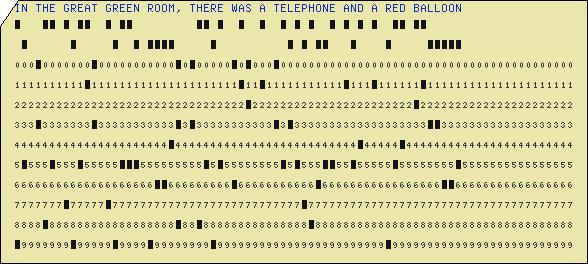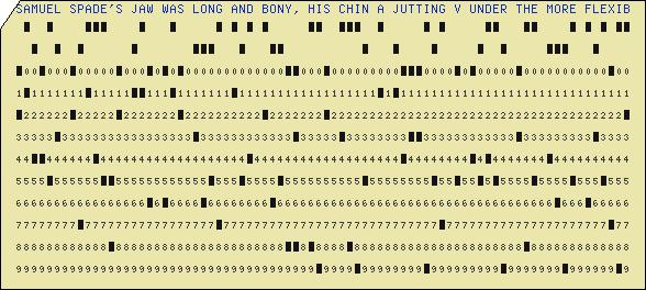 Isn't this great? I bumped into a wonderful site called kloth.net (http://www.kloth.net/services/cardpunch.php) that provides a free-to-all and unrestricted use of their punch card emulator. It was found while looking for dating ideas for an IBM 5081 card that I have that has programming information for the BINAC computer (ca. late 1940's), and kloth.net had info on the history of IBM cards as well as the emulator--plus other stuff. Completely distracted from the BINAC quest, I created some cards using some great first lines of literature. You can play too!