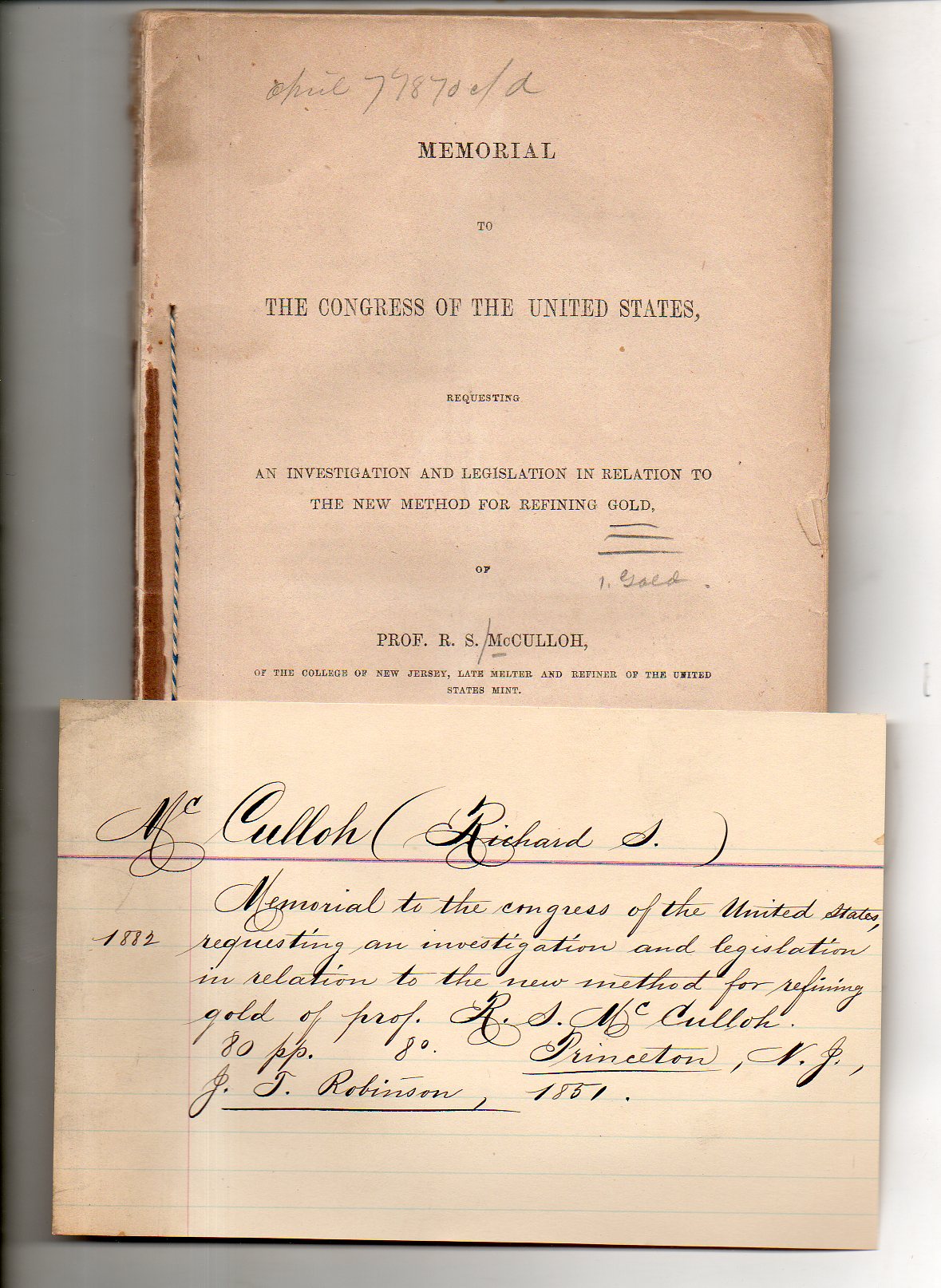 Here is what the "flare" is about, a lonely hand-written catalog card for a surplus(ed)/duplicate pamphlet from the Library of Congress. The work is by Richard S. McCulloch, and called Memorial to the Congress of the United States Requesting an Investigation and Legislation in Relation to the New Method for Refining Gold (printed by John T. Robinson in Princeton, N.J., in 1851).