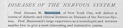 There was a Dr. Hammond teaching there in 1895, and that Dr. Hammond was Greame Hammond, M.D., of New York City, and who was at one time president of the Neurological Section of the New York Academy of Medicine (and succeeded by the great Hillary Putnam Jacobi, reference the Chicago Medical Recorder, volume 4, January-June 1893). Dr. Hammond is listed as a "Professor of Special Subjects", that being "disease and nervous system".