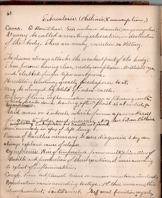 The work contains notes and observations with the following headings: jaundice, coma, cetalepsy/hysteria, apoplexy, croup, stomatitis, chancrum oris, ptyalism, quinsy, diphtheria, goiter, capilary bronchitis (pp 40-43), asthma (44-46), pneumonia (the disease which would kill Dr. Fiske in 1922, pp 46-51, emphysema (52-3), whooping cough (54-5), tuberculosis (60-3), empyema (64), pneumo-hydro-thorax (65), acute gastritis (66-7), dyspepsia (68-9), cancer of stomach (70-72), inflammation of instestine (74-5), acute anticular rheumatism (78-9), gout (80), arthritis (81), muscular rheumatism (83), typhilitis (86), perityphlitis (88-9), dysentary/blood flux (90-2), cholera morbus (93-95), Cholera (96-9), Perionitis (103), intestinal worms (104-107), trichinae spiralis (108-9), lead poisoning (110-111), Cirrhosis of the liver (112-115), jaundice and hepatic colic (116-117), diabetes (118-121), eczema (122-4), fever (122-7), grip (128-131), typhoid fever (134-139), Bright's disease (140-5), [various/sundry, 146-9], variola/small pox (150-3), epilepsy (154-5), [156-161 blank], diphtheria (162-5), diarrhoae (166-176), chronic constipation (176-7), adenoids (178), acute shingles (179-180), diseases of the nervous system (181-186), locomotor ataxy (187-191), polio (192-195), sciatica 196-7), athetosis (198), traumatic epilepsy (199), hysteria, neurasthemia (203-205), sexual neurasthemic (205), epilepsy (206-209), coebral Haemorrage (210-212), St. Vitus Dance (216-216), facial paralysis (215-216), neuralgia (217-218), paralysis (219), hypnosis (221).