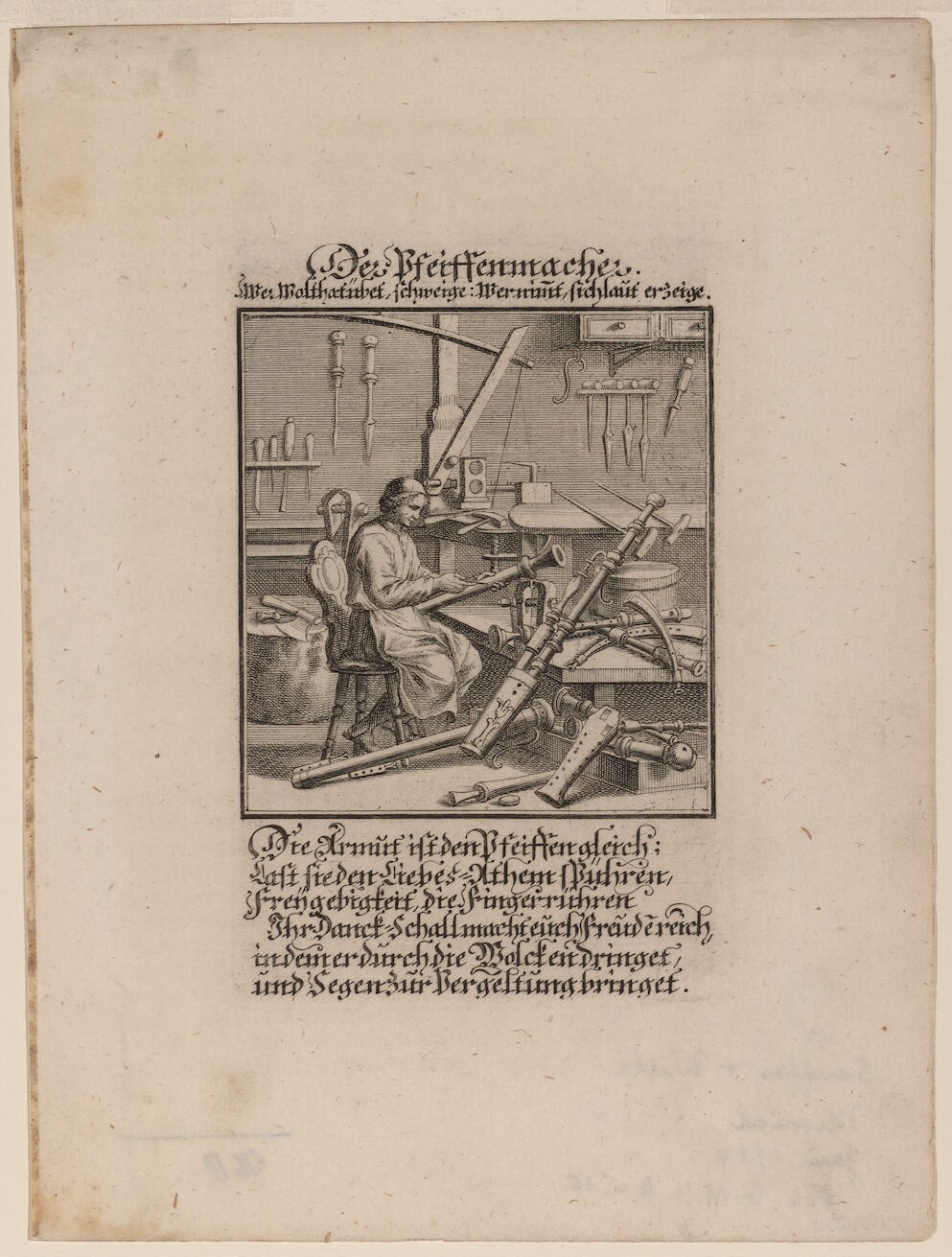 I was very excited when I bumped into this notation for Christoph Weigel's (1654-1725) "der Pfeiffenmacher" (the Wind Instrument Maker)! I hurriedly thought as I went to click on the link for the image what sort of instruments or tools were being made to make use of the wind in 1700? Better yet maybe--what was being built for wind protection? And then as quickly as it started the speculation stopped--it was for a wind instrument maker, a maker of wind instruments, musical instruments. Of course it is a beautiful engraving (after a design by Caspar Luyken, 1672-1708) but it was just a little disappointing not to see a collection of scientific instruments or engineering/architectural bits rather than an assortment of musical ones. (This is from the Library of Congress and the notes in the description identifies the instruments so: Bassoon, Shawm, Curtal, Cornett, Recorder, Oboe.)