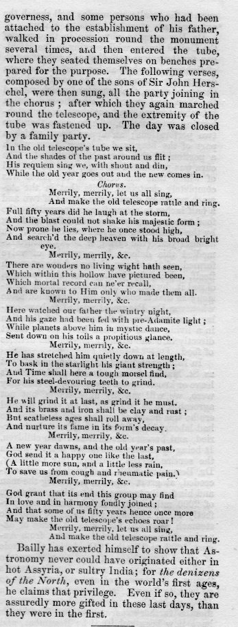 "In the old Telescope's tube we sit, and the shades of the past around us flit; His requiem sing we, with shout and din, while the old year goes out and the new comes in"--Verses composed by a child of John Herschel, on final resting place of the great 40' telescope, 1840
