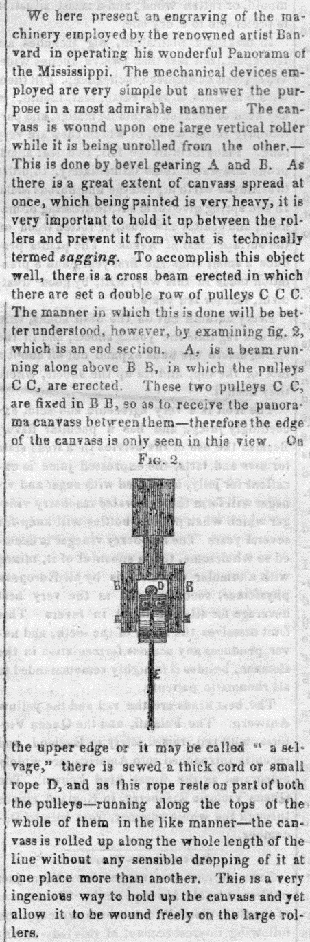 The image above is from The Scientific American for December 10, 1848, and shows how Mr. Branverd figured out a knotty problem with the display of his super-massive work. Unfortunately, at the end of the life of the canvas it was cut into smalkl fragments and sold--evidently none of it survives.