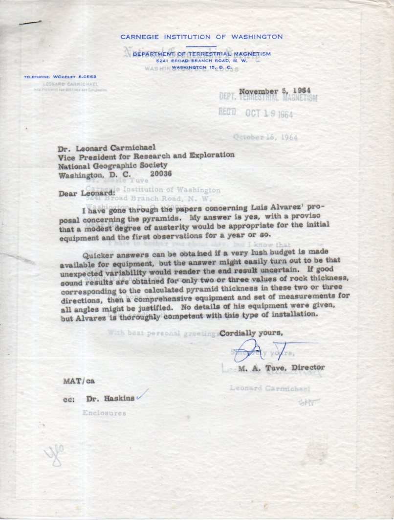 This is a little peek behind the curtain, a tiny view into the process of funding an experiment using cosmic rays to look for hidden chambers in the pyramids by a Nobel Prize recipient. The letter is from Merle Tuve (a very major player in the development of RADAR and much else) when he was the director of the Department of Terrestrial Magnetism (part of the Carnegie Institution), writing from its beautiful campus in a leafy section of NW DC. The letter was written in 1964--its actually a carbon of the letter that Tuve sent to Leonard Carmichael (VP at National Geographic who must've gone fishing for the money for the research), the copy being sent to Caryl Haskins, who was president of the Carnegie.