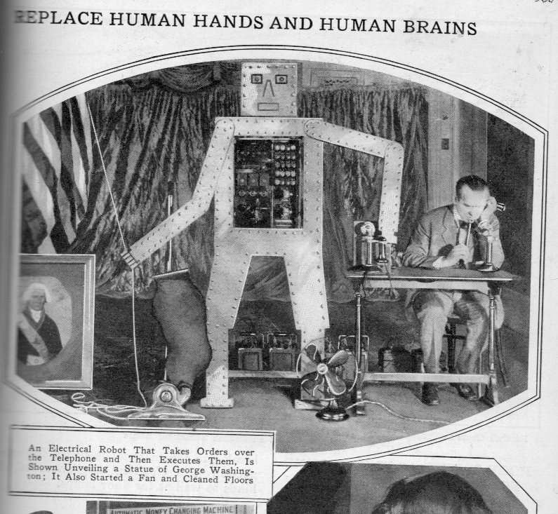 I have a few robots to add to this blog's collection of robots--both are from the same volume of Popular Mechanics for 1928. The first features a large manikin-like robotic cut-out, with a few swivel joints, and performs a couple of tasks. More than likely this was all that it could do.